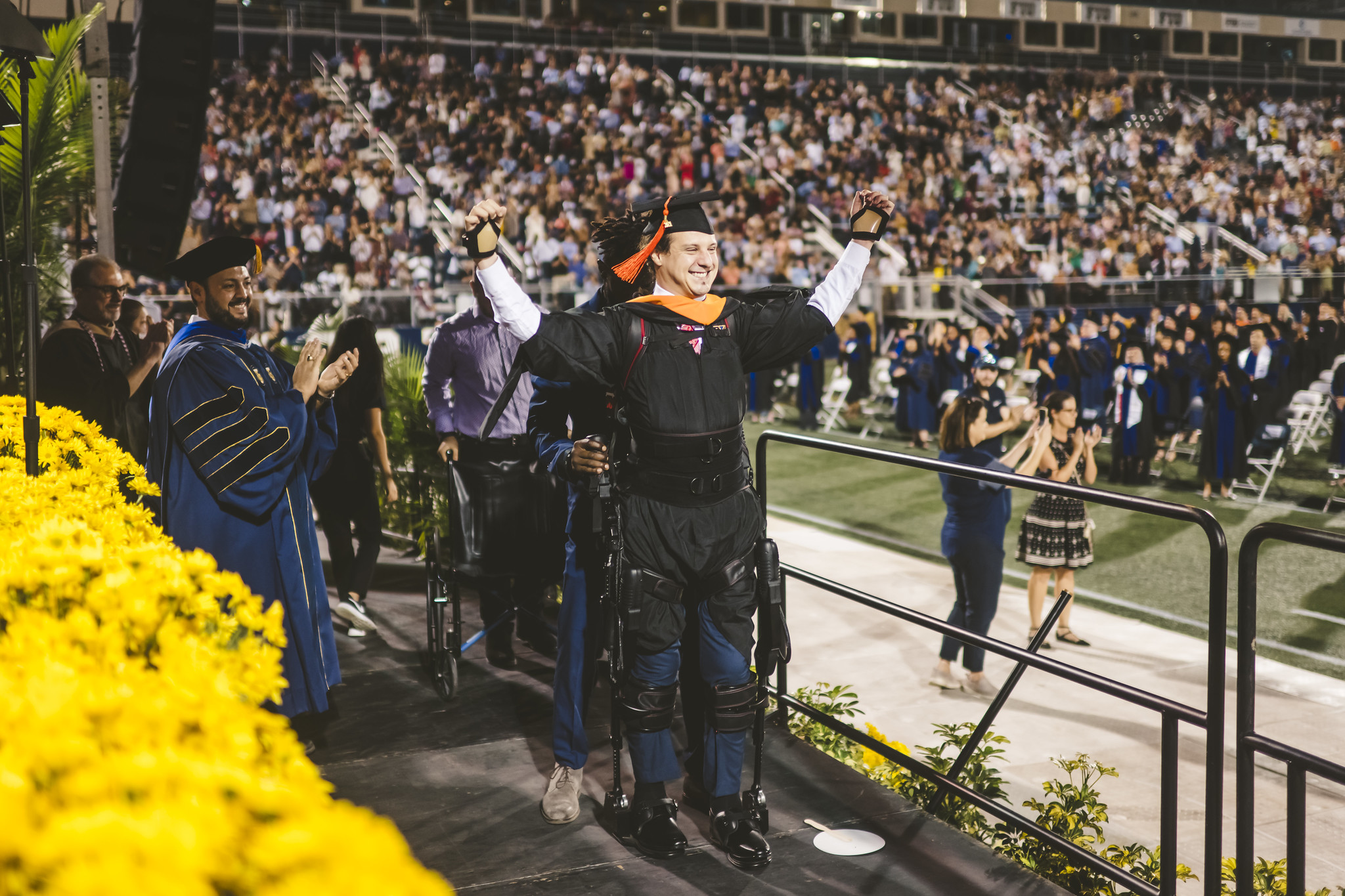 Aldo Amenta became paralyzed several years ago as he was starting his career at Florida International University. Undeterred, he continued his studies. In 2018, he made international news when he walked across the commencement stage using an exoskeleton to receive his bachelor’s degree from FIU’s College of Engineering and Computing.