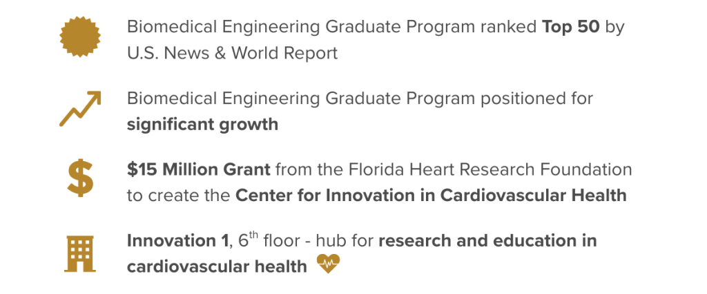 The opening of Innovation 1 helps us keep our strategic growth right on track. Take our biomedical engineering graduate program, for example. This top 50 program (according to U.S. News and World Report) is one of many receiving a significant boost. Earlier this year, the Florida Heart Research Foundation awarded us a grant of nearly $15 million to create the Center for Innovation in Cardiovascular Health, an ambitious research and education center located on the sixth floor of Innovation 1.